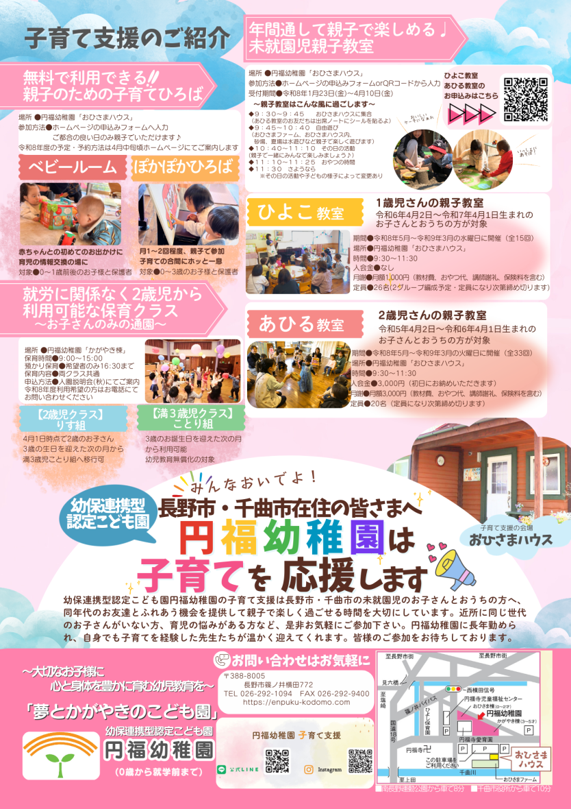 お知らせ 令和8年度未就園児親子教室参加者募集しています 2026.02.03 category お知らせ 令和8年度も、5月から未就園児親子教室(あひる教室とひよこ教室)を開講します。 詳しくは下記画像をご覧ください。