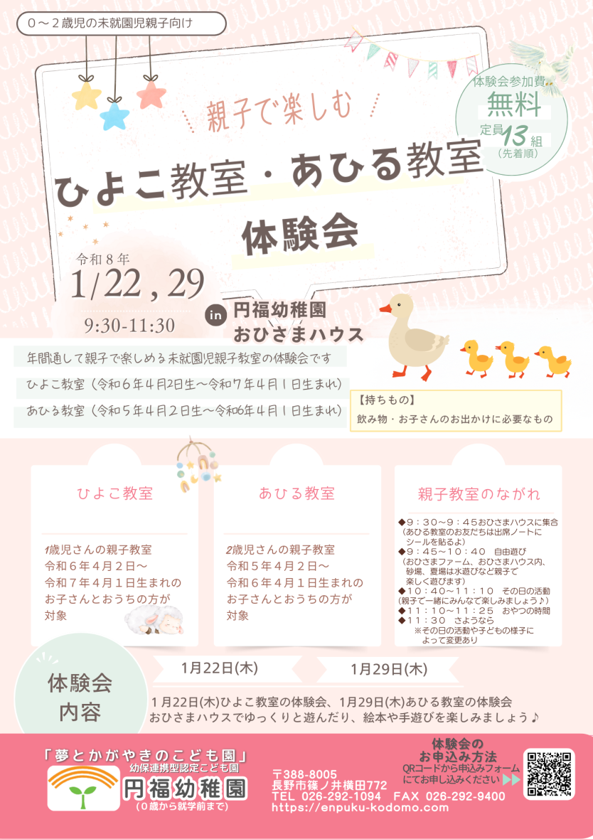 - ひよこ教室体験会 令和8年1月22日(木)9:30〜11:30