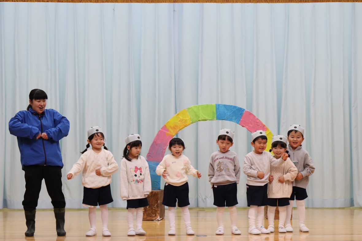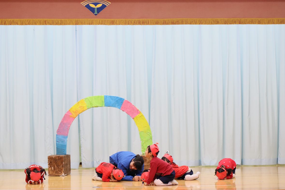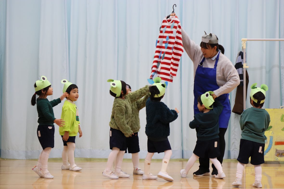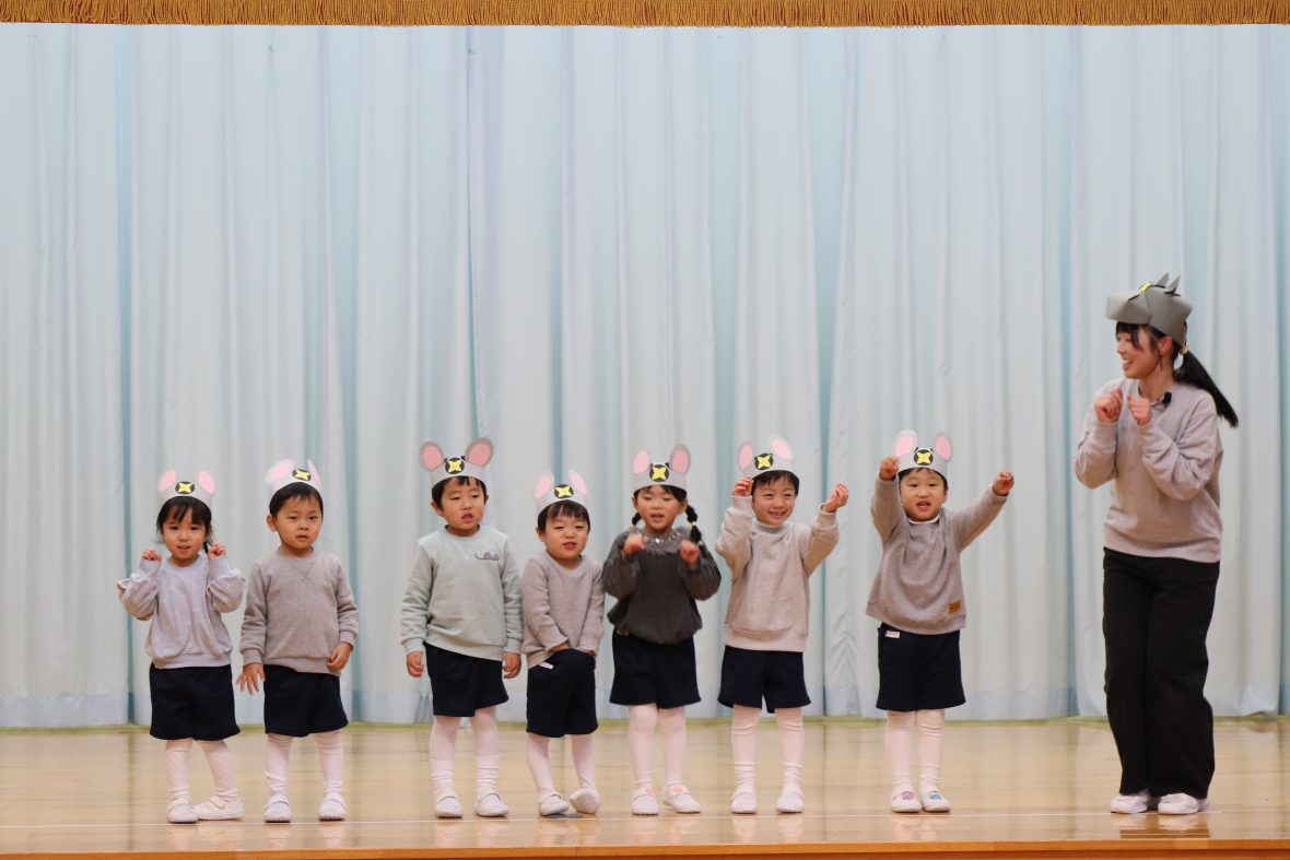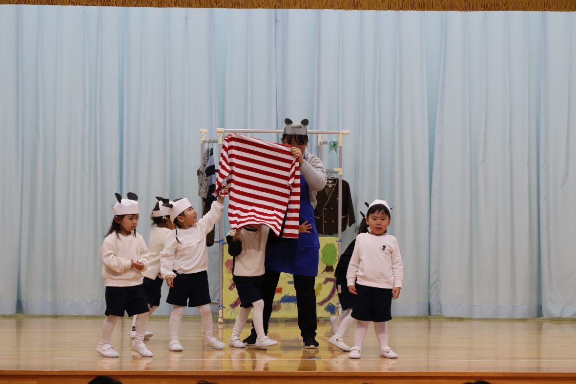 年少組は、担任の先生と一緒にステージに上がり、表現遊びを行います。クラス様々な絵本に振れ、子どもたちが好きなお話を題材にして表現遊びを楽しんできました。