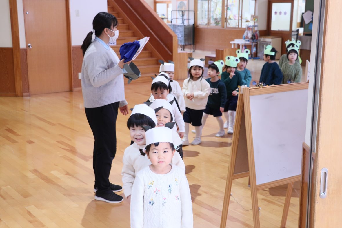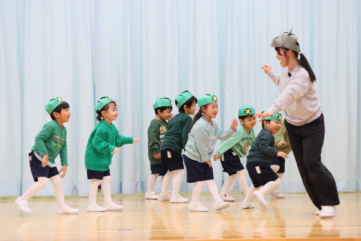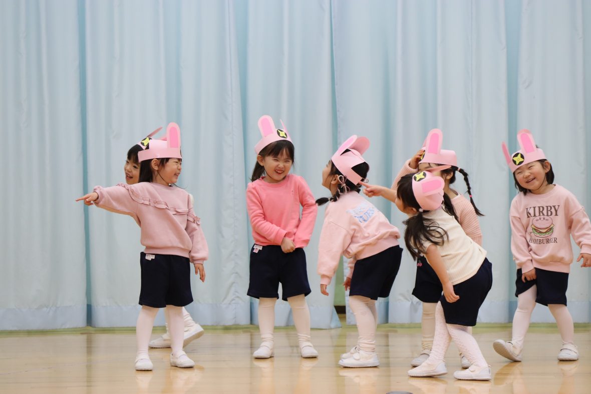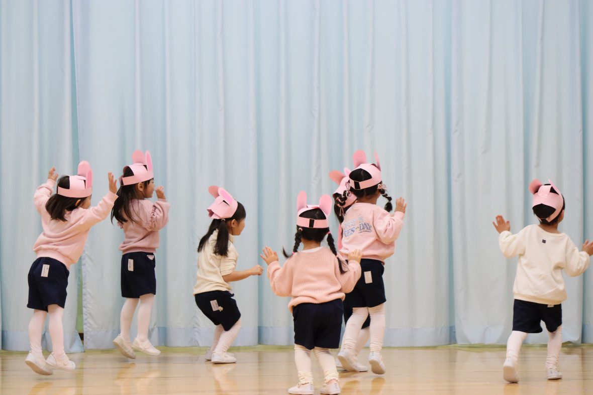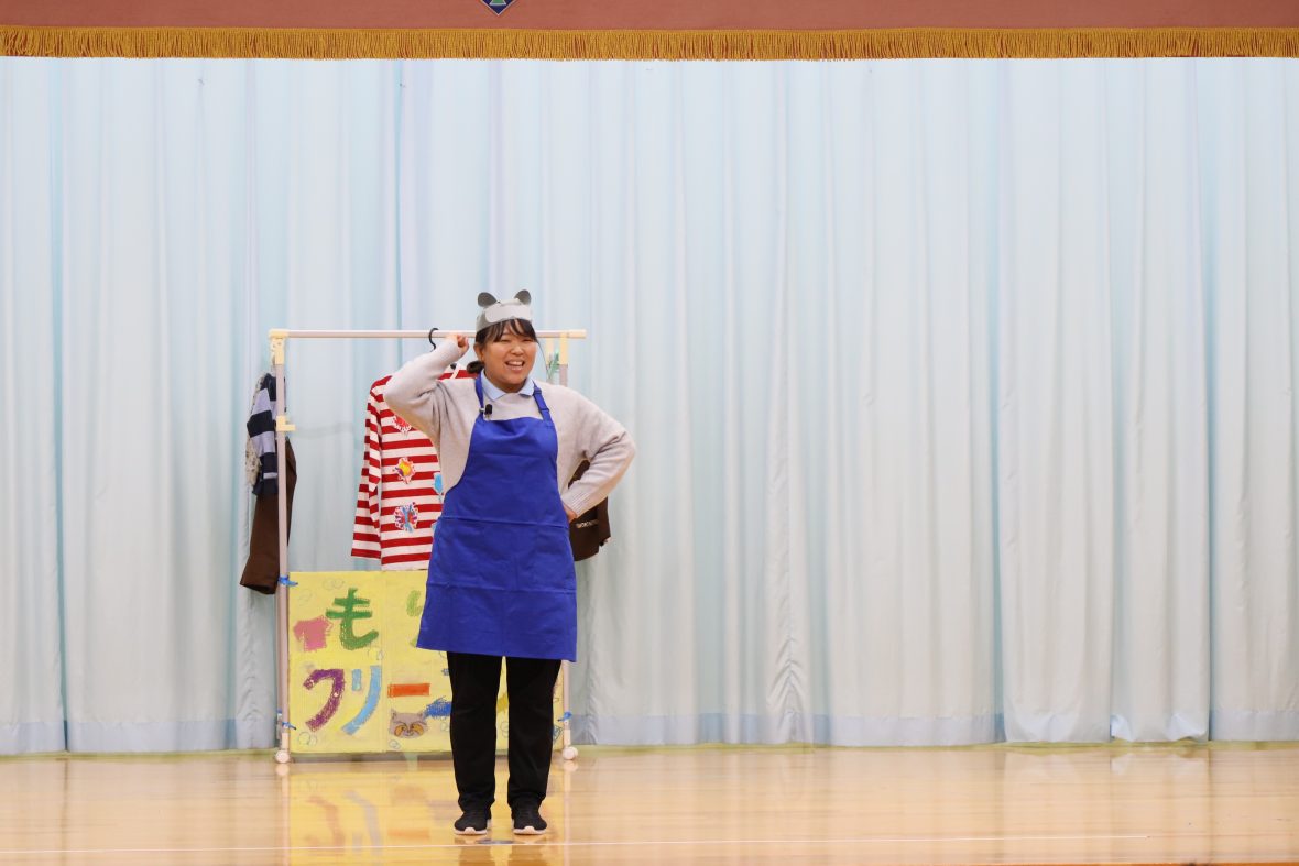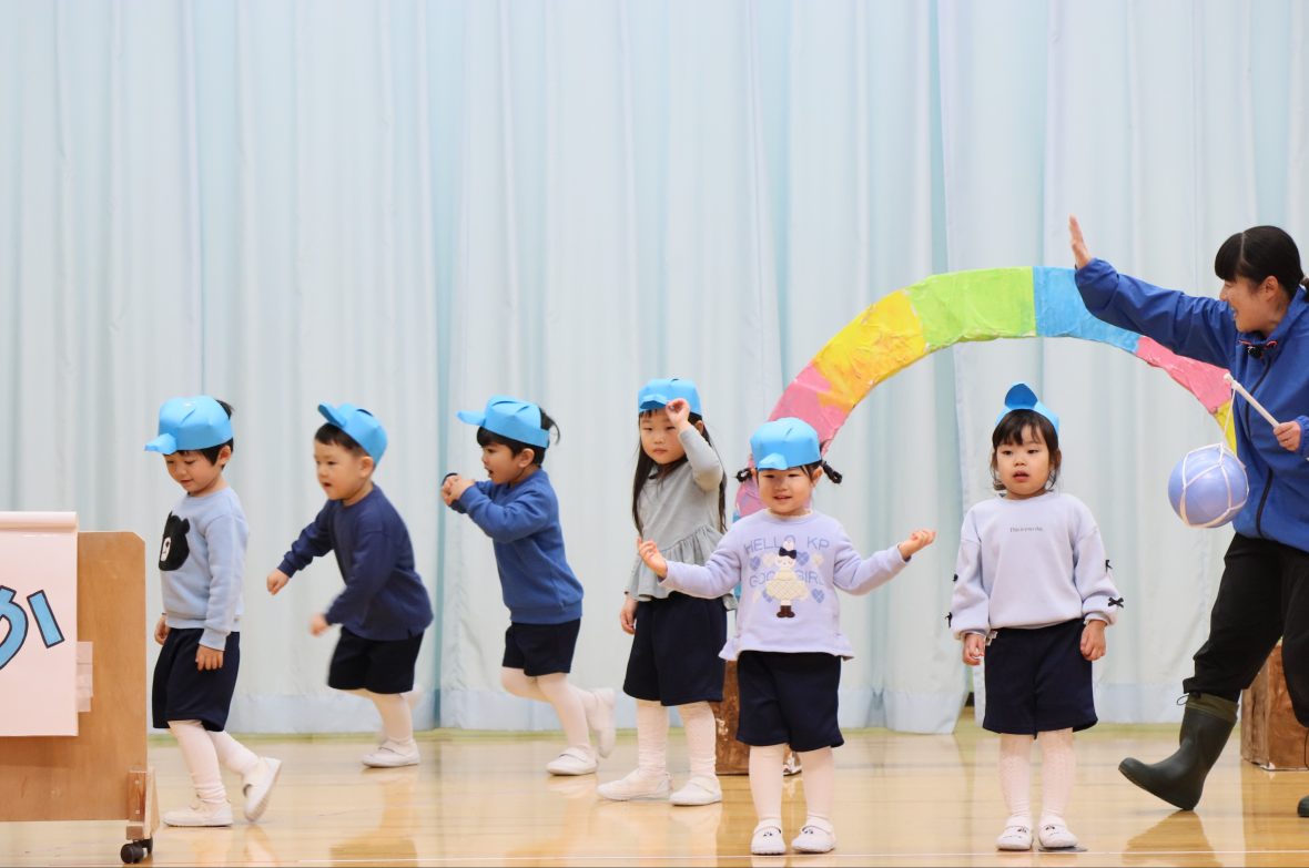 年少組は、担任の先生と一緒にステージに上がり、表現遊びを行います。クラス様々な絵本に振れ、子どもたちが好きなお話を題材にして表現遊びを楽しんできました。